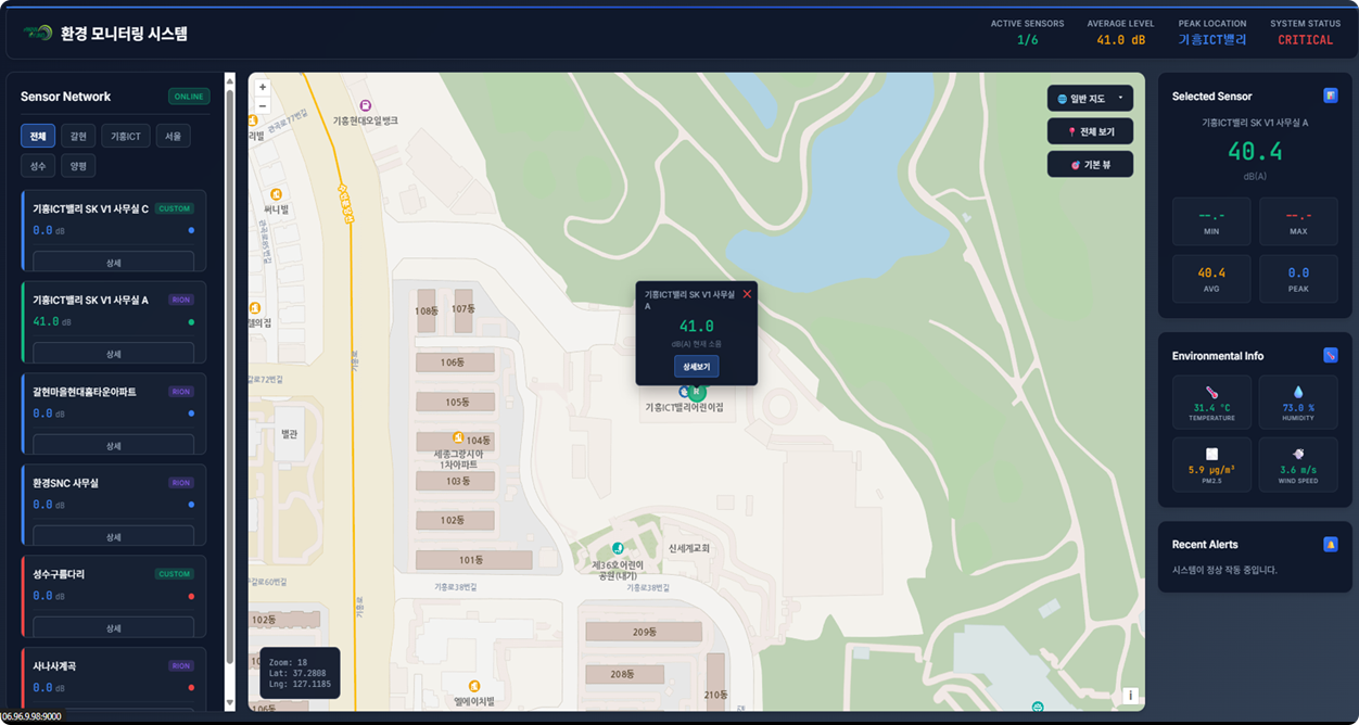 RION과 같은 정밀 측정 장비를 활용하여 현장에 설치된 시스템이 24시간 내내 자동으로 환경 소음을 측정하고 데이터를 서버로 전송합니다.